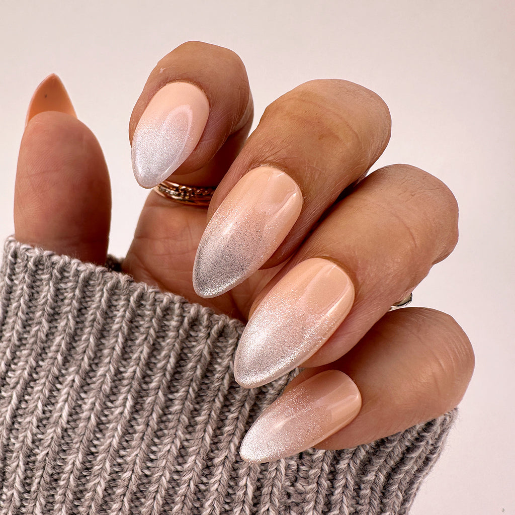 Peachy Prism: A dreamy fusion of soft pink ombre, topped with a sprinkle of shimmering glitter for that perfect touch of sparkle.