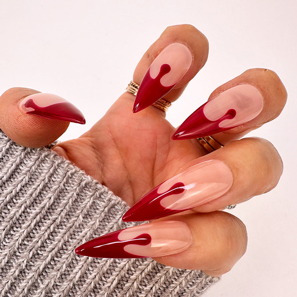 Blood Drip French: A nude base with bloody red French tips, finished with blood drip details for the ultimate spooky-chic Halloween look.