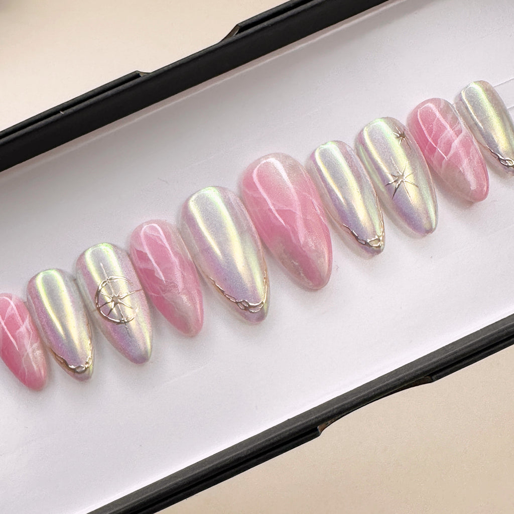 Dewy Compass: Pink + aurora chrome with subtle gold details