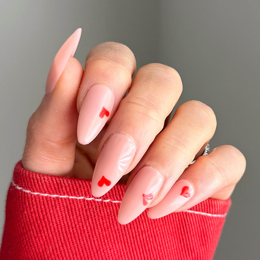 RED KISSES & HUGS: These dainty nails feature adorable red hearts, creating a sweet and playful look.